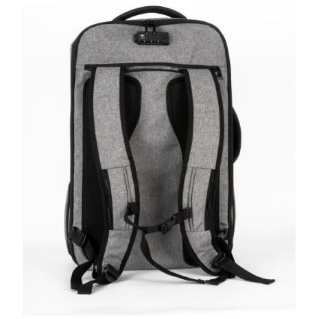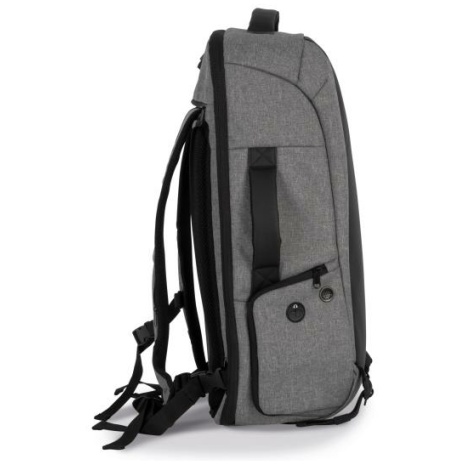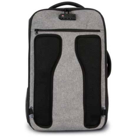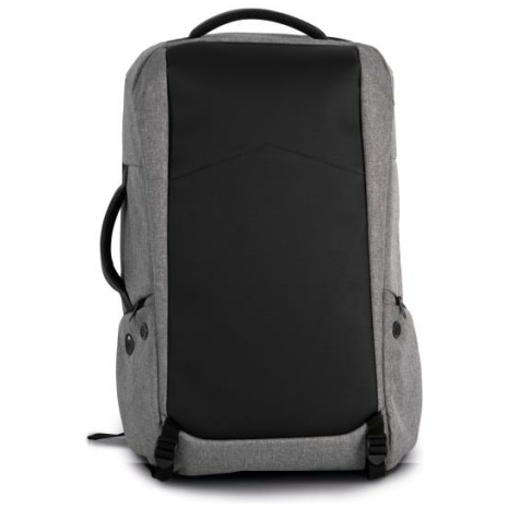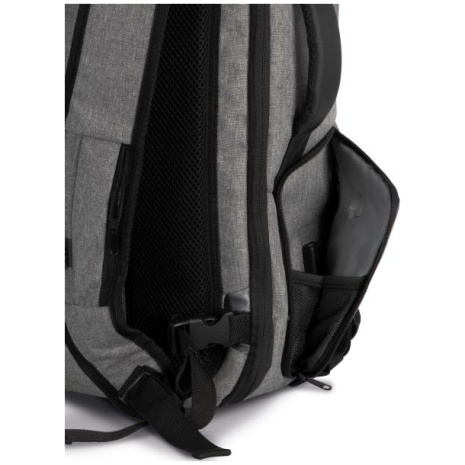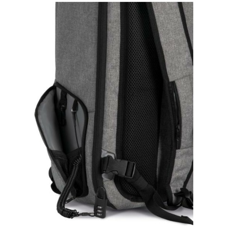 Antidiefstalrugzak van polyester. RFID-bescherming tegen skimmen. Ritssluiting tegen diefstal met TSA-cijferslot. USB-poort om 1 apparaat te laden en 1 poort voor micro USB-kabel, om 1 Powerbank aan te sluiten. 100 % polyester. Waarvan 50% gerecycled polyester. Rugzak met ritssluiting tegen diefstal dankzij een TSA-cijferslot . Zijzak met een anti-diefstalkabeltje en een binnenzak met een RFID-bescherming. Gewatteerde verstevigingen op de achterzijde, gewatteerde, aanpasbare schouderbanden en een regelbare borstriem, twee riemen onder de tas, twee zijzakken, een oplaadzak met een USB-poort en een micro-USB-poort (kabel inbegrepen). Twee ritszakken op de schouderbanden en een afneembare, gewatteerde schouderriem. Het hoofdvak van de tas is van het rugvak gescheiden door mesh met een ritssluiting. Het rugvak heeft een vak voor een computer van max. 15″ en een gewatteerd vak voor een tablet tot 11″, een zak van mesh en twee uitneembare ritstasjes voor kabeltjes en accessoires.