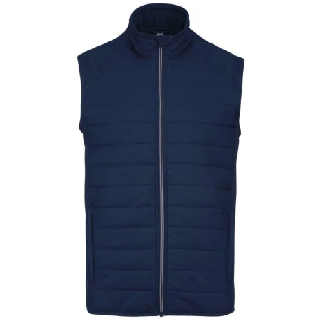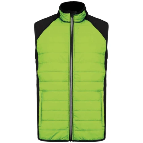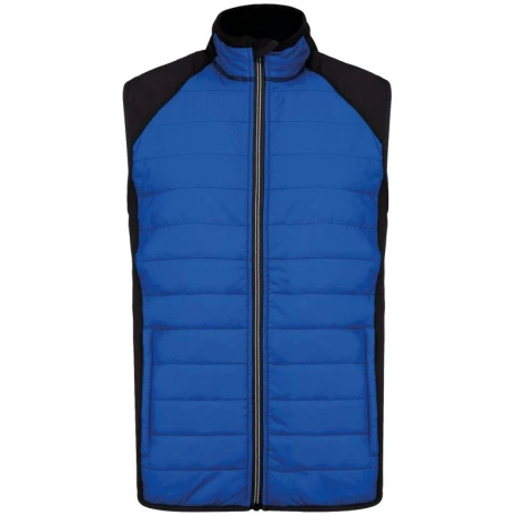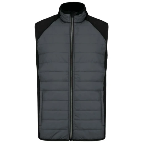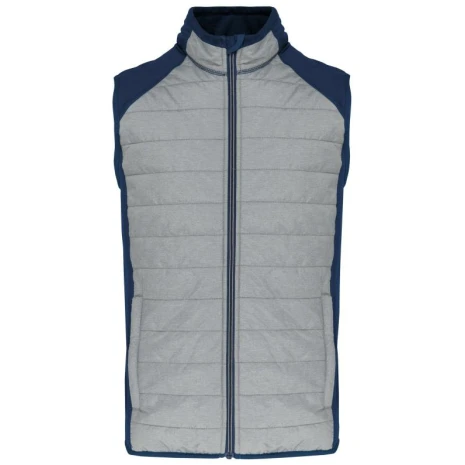 BODYWARMER BI-MATERIAALÂ 100% ripstoppolyamide : heel sterk Waterafstotende behandeling Heel comfortabele stof. Buitenkant: 100% polyamide ripstop body met waterafstotende behandeling; zijkanten en achterkant 90% polyester / 10% elasthan. (Marl Grey / Sporty Navy: 100% polyester). Binnenvoering: 100% polyester. Ultra comfortabel materiaal. 2 zakken met rits aan de voorzijde. Contrasterende ritssluiting. Elastisch aan mouwuiteinden en onderkant. 1 drukkersrits aan de hartzijde.