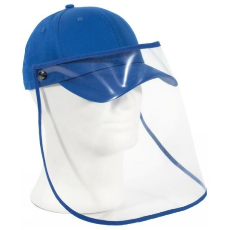 Cap met transparante visor Transparante, halfharde, afneembare en wasbare zonneklep. Ideaal als aanvulling op een mondmasker. Dit product biedt extra bescherming en voorkomt dat het gezicht wordt aangeraakt met de handen. Regelbare klittenbandsluiting voor een optimale aanpassing. 100%. katoen. 100% katoen sergé. Cap met 6 panelen. Verstelbare sluiting door middel van een klittenband. De cap wordt geleverd met een halfharde, transparante, afneembare en op te heffen gelaatsscherm van thermoplastisch polyurethaan, ideaal als extra bescherming. Het gelaatsscherm is flexibel, licht en herbruikbaar. Het kan ook gedragen worden met een bril. Het kan worden gewassen met zeep of andere handwasproducten. Het neemt deel aan de strijd om te beschermen tegen druppels en projecties maar vervangt niet de barrièremaatregelen en de regels van de sociale afstand die essentieel zijn voor de strijd tegen de verspreiding van infecties, met name virale infecties van het type Covid-19. Deze cap is geen persoonlijk beschermingsmiddel (PBM) en is geen vervanging daarvan.