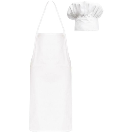 Chefkok-set voor kinderen Complete kit, ideaal voor koks in de dop. Gemakkelijk in onderhoud. 100% katoen. Set bestaande uit een koksmuts en een schort. Regelbare koksmuts dankzij klittenband.