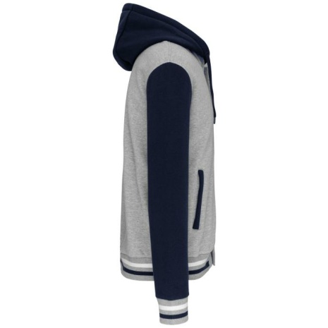 College jacket met capuchon unisex De tijdloze Teddy, bezield door Amerikaanse universiteiten. Optimaal comfort. Hip en veelzijdig. 70% katoen / 30% polyester. Geborsteld fleece 3 draden. Contrasterende ingezette mouwen. Driedelige capuchon, voering in jersey en contrasterende koordjes. Sluit aan de voorkant met drukknopen. Ribboord met 2 contrasterende biesjes aan kraag, mouwen en onderkant. 2 omzoomde zakken aan de voorkant. Nektape met visgraatmotief en ophanglus in de kraag. Geen merklabel in de kraag, maar enkel een maatlabel voor eenvoudige personalisatie. De legendarische College jacket gaat al vele jaren mee. Hij is alomtegenwoordig: van de straat tot de schoolbanken en zelfs het podium.
