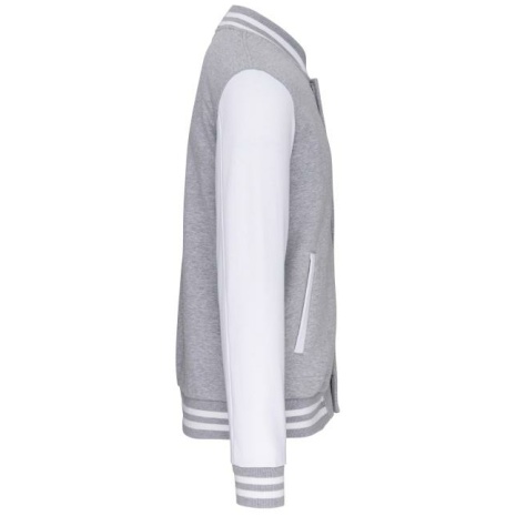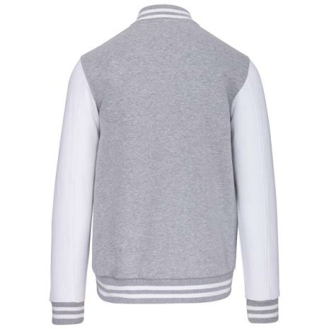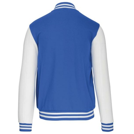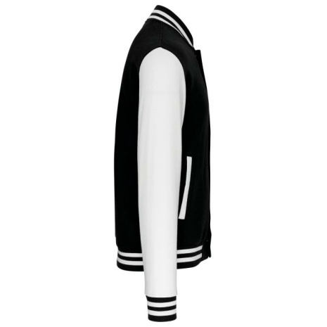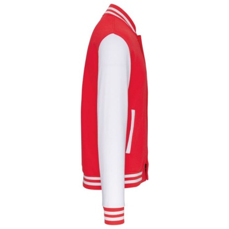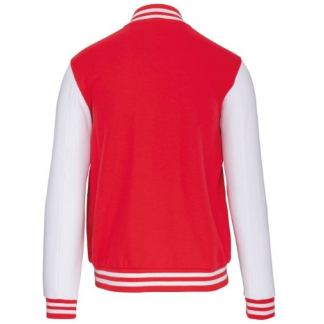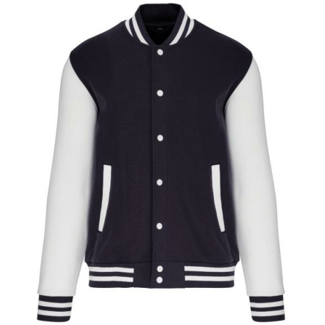College jacket unisex De tijdloze Teddy, bezield door Amerikaanse universiteiten. Optimaal comfort. Hip en veelzijdig. 70% katoen / 30% polyester. Geborsteld fleece 3 draden. Contrasterende ingezette mouwen. Sluiting aan de voorkant met contrasterende drukknopen. Ribboord met 2 contrasterende biesjes aan kraag, mouwen en onderkant. 2 contrasterende omzoomde zakken aan de voorkant. Nektape met visgraatmotief en ophanglus in de kraag. Geen merklabel in de kraag, maar enkel een maatlabel voor eenvoudige personalisatie. De legendarische college jacket gaat al vele jaren mee. Hij is alomtegenwoordig: van de straat tot de schoolbanken
