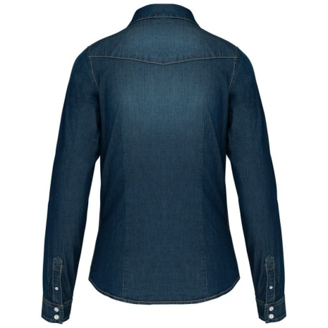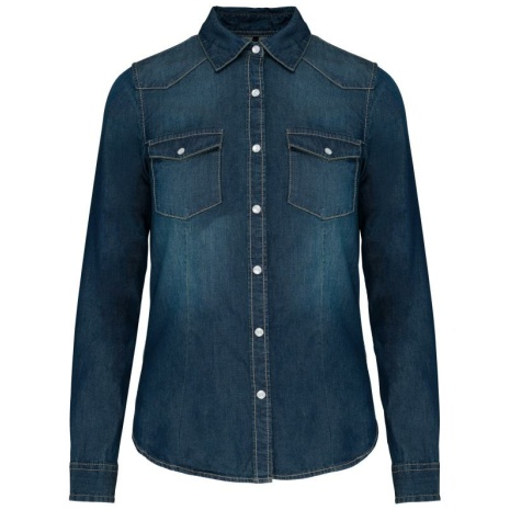 Dames denim blouse lange mouwen Trendy, comfortabele en getailleerde snit. Zacht en uitstekend bedrukbaar. Trendy vintage verwassen effect. 100% katoen. Gewassen met enzymen. Getailleerde snit. Fantasie drukknopen. 2 borstzakken met overslag en drukknoop. Inzetstukken aan de rug en voorkant. Mouwuiteinden met drukknopen. Afgerond boord aan de onderkant. Dit product kreeg een speciale behandeling om het er verouderd te laten uitzien. Dit ambachtelijke procedé maakt dat er kleurverschillen zijn tussen de producten, waardoor elk stuk uniek is.