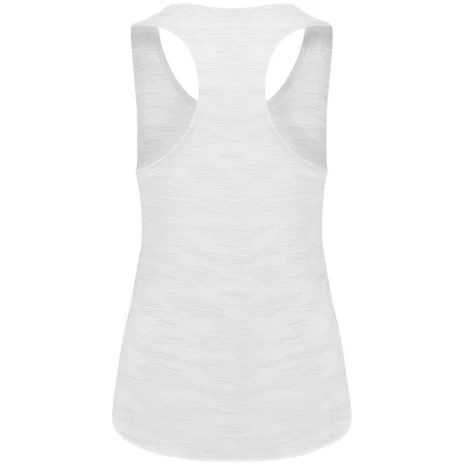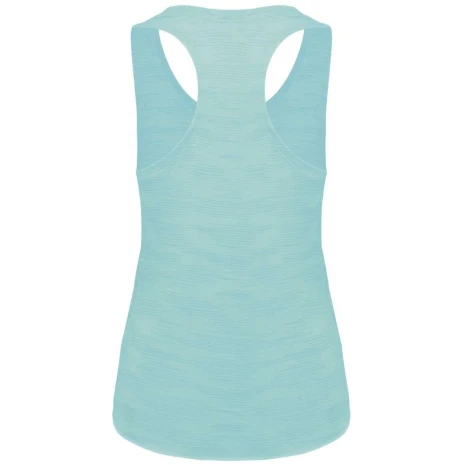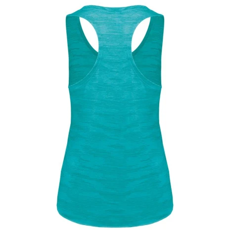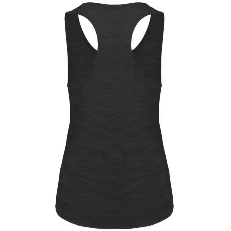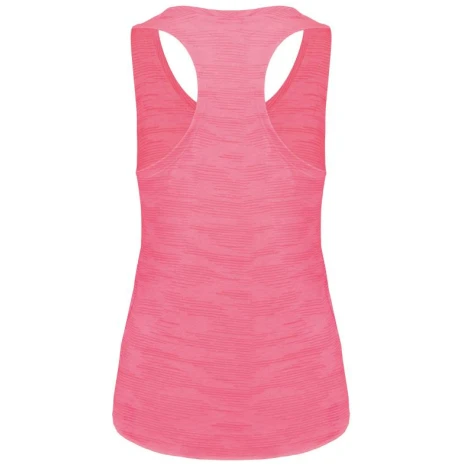 Dames sporttop Soepel jerseytricot met gevlamd effect. Ruime snit en grote mouwopeningen voor meer comfort. Blijft beter zitten dankzij de racerback. 65% polyester / 35% viscose – Soepel jersey met gevlamd effect. Ruime snit. Grote armsgaten en racerback. Ronde halsopening met nektape aan de binnenkant. Licht afgerond boord.