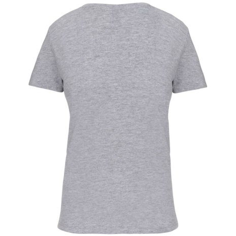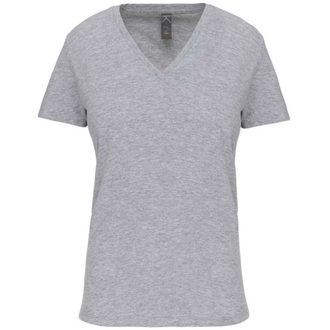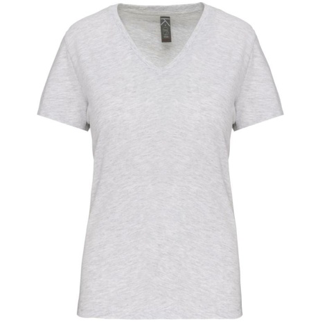 Dames-t-shirt BIO150IC V-hals Een altijd trendy kledingstuk, voor een meer verantwoorde mode. Effen kleuren : 100% katoen. Kleur Ash Heather 98% katoen / 2% viscose en Oxford Grey : 90% katoen / 10% viscose. Alle kleuren zijn gemaakt van biologisch katoen. V-hals in ribboord met elasthan. Toon op toon nektape. Dubbel stiksel aan mouwuiteinden en onderkant.
