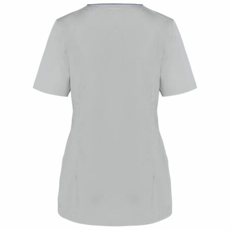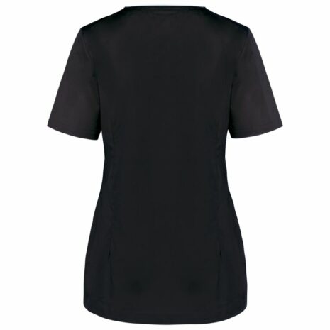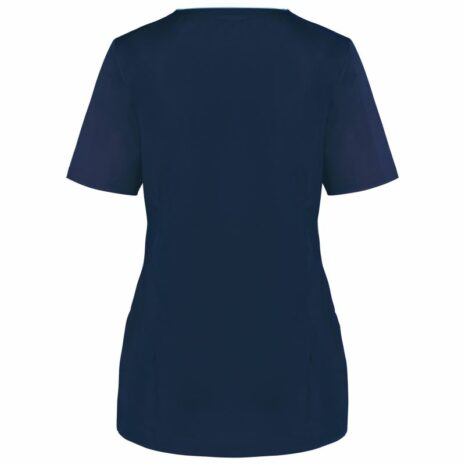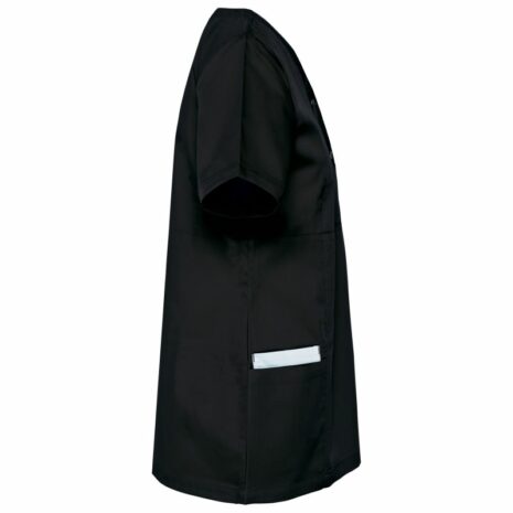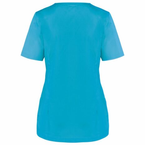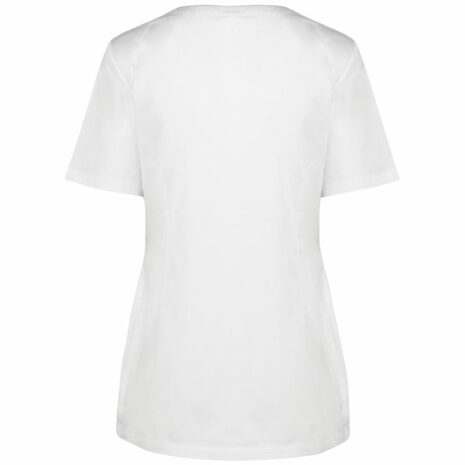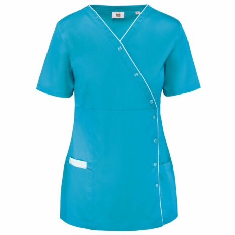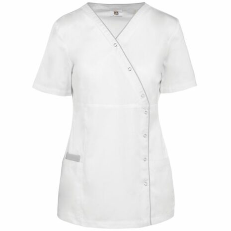 Damesblouse in polykatoen met drukknopen Stevige, polykatoenen stof die de hele dag aangenaam zit. Kan industrieel worden gereinigd en belooft zo dagelijks een hoge bescherming en hygiëne. Handige en mooie stofjas. 65% polyester / 35% katoen. Twillstof. Norm ISO 15797 Industrieel wassen 75 °C (20 wasbeurten). Vrouwelijke, getailleerde snit dankzij plooien aan de voor- en achterkant. V-hals, asymmetrische sluiting met drukknopen. 2 zakken vooraan, waarvan één (rechts) met twee vakjes (binnenzak met contrasterende boord). Contrasterende bies aan de halsopening en langs de knoopsluiting. Naamlabel aan de binnenkant. Tear-away merklabel.