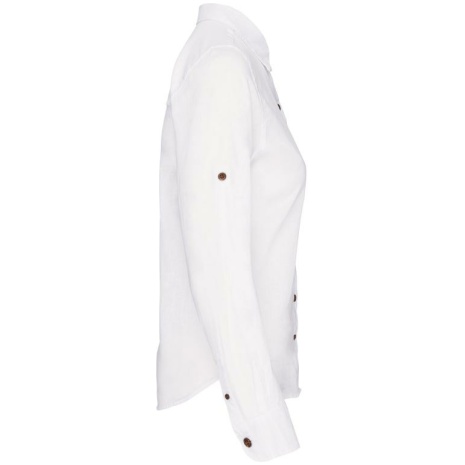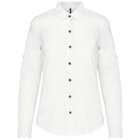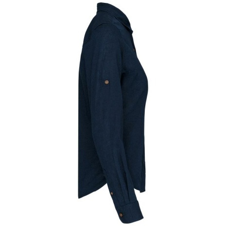 Damesoverhemd van linnen met lange mouwen Moderne en casual look. Modieuze snit die soepel en licht valt. Zacht, comfortabel en sterk dankzij de mix van linnen en katoen. 55% linnen / 45% katoen. Contrasterende knopen. Fantasiebies op de bovenkant van de knooplijst. Verstelbare mouwuiteinden met knoop. Opstroopbare mouwen met een knooplijst. Extra knoop.