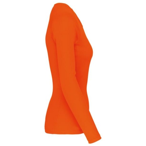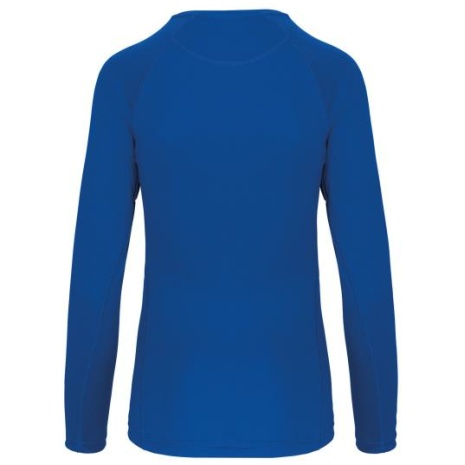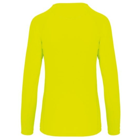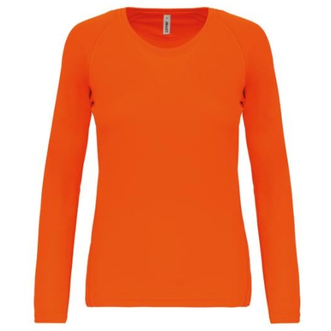 Damessportshirt Lange Mouwen Lichte en sneldrogende stof. 100% polyester : heel sterk, licht en ademend. Ronde halsopening met nektape aan de binnenkant. 100% polyester. Sneldrogende lichte stof. Ronde hals. Nektape. Afwerking met dubbele stiksels aan de mouwuiteinden en onderkant.