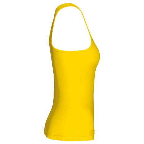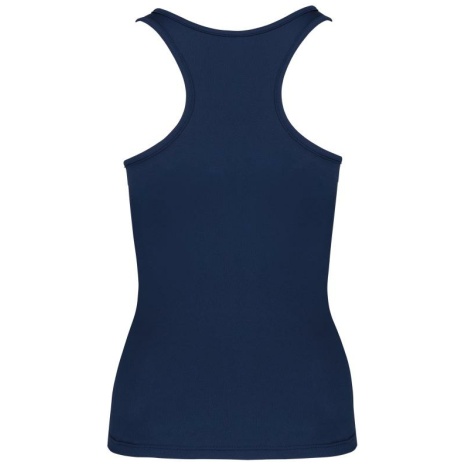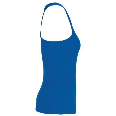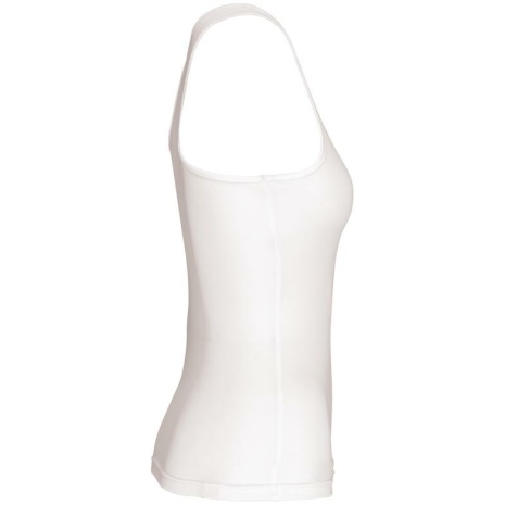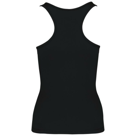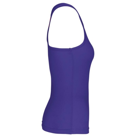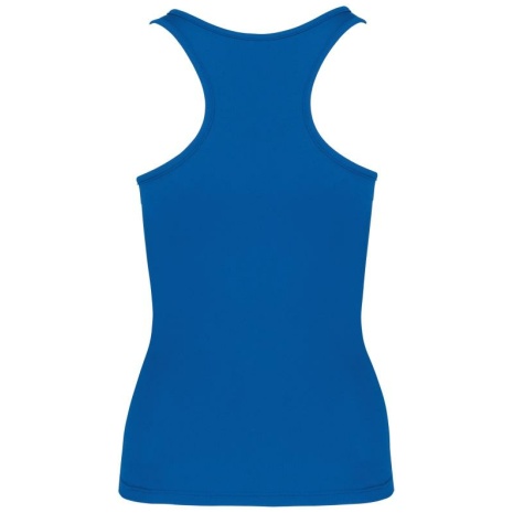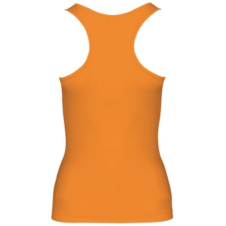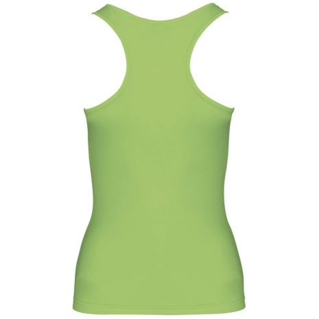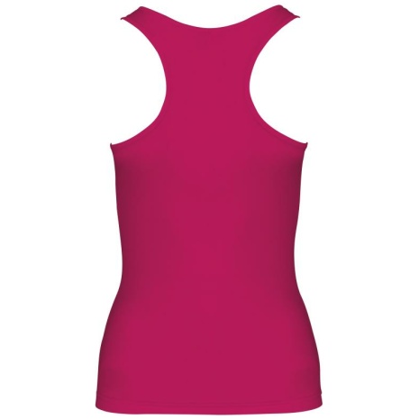 Damessporttop 100% polyester: heel sterk, licht en ademend. Lichte en sneldrogende stof. Blijft goed zitten dankzij de racerback. 100% polyester. Sneldrogende lichte stof. Afwerkingsbiesje aan de halsopening en mouwinzet. Afwerking met dubbele stiksels aan de mouwuiteinden en onderkant.