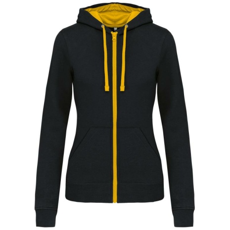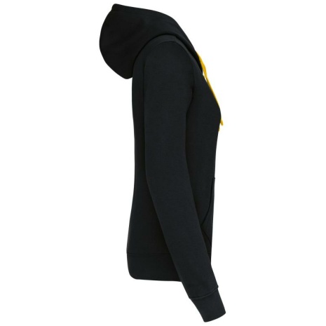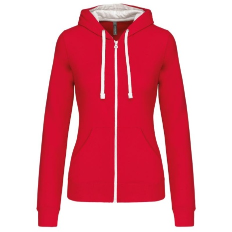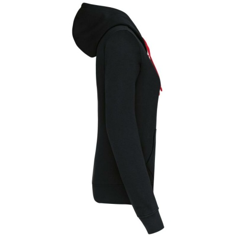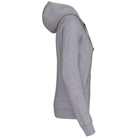 Damessweater met rits en capuchon in contrasterende kleur Tijdloos en heel comfortabel. Geborsteld fleece aan de binnenkant, voor een optimaal comfort. Snoeropening voor headset in de kangoeroezak en halsopening. 80% katoen / 20% polyester (Oxford Grey: 76% gekamd katoen / 21% polyester / 3% viscose). Geborsteld fleece aan de binnenkant. Gaatje voor draadje en lusje aan de kraag voor oortjes. Ribboord aan mouwuiteinden en onderkant kledingstuk. Gevoerde capuchon in contrasterende kleur met aanrijgkoordjes. Rits in contrasterende kleur.