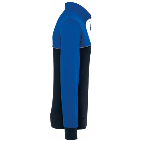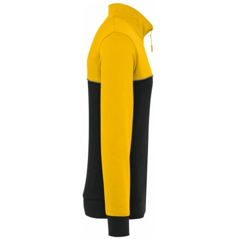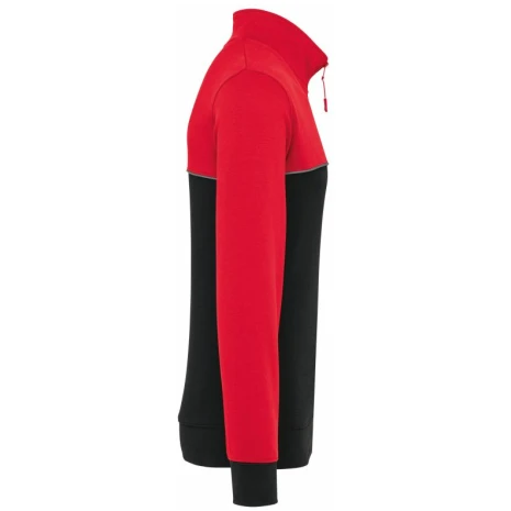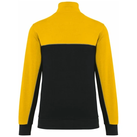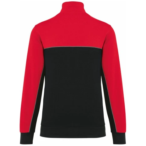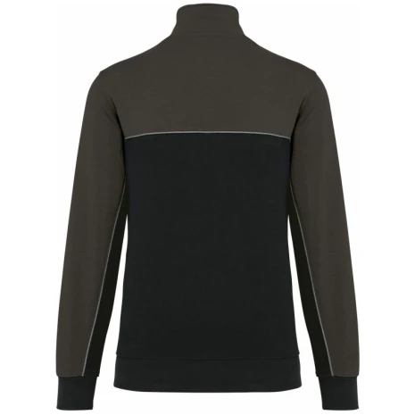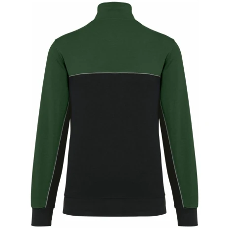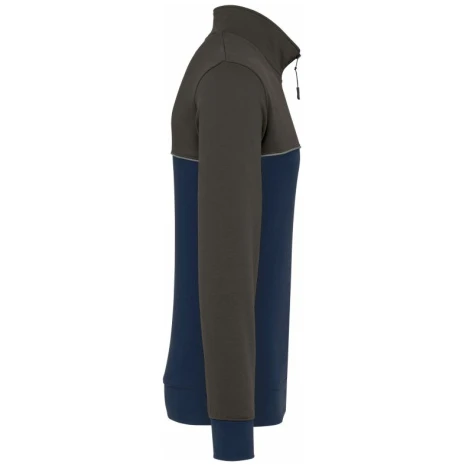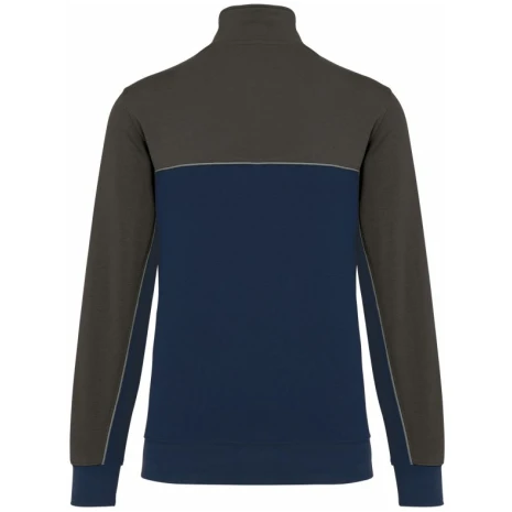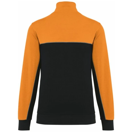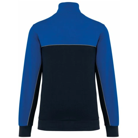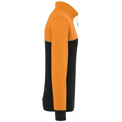 Ecologische uniseks sweater met ritskraag Geborsteld fleece aan de binnenkant, voor meer zachtheid en comfort. Gemaakt van 3 LSF-draden: sterk en wasbestendig. Trendy en ecologische werkkledij. 60% biologisch katoen / 40% gerecycleerd polyester. Aan de binnenkant geborsteld fleece 3 draden LSF (Low Shrinkage Fleece). Fitted pasvorm. Ingezette mouwen. Kraag met plastic rits en gerecycleerde toon-op-toon ritstrekker. Contrasterende nektape met visgraatmotief. Halvemaanvormige halsopening op de achterkant, voor eenvoudige personalisatie van het merk aan de binnenkant. Contrasterende bies tussen de tweekleurige delen van het kledingstuk (lichaam, voorkant mouwen en rug). 1×1 ribboord aan mouwuiteinden en boord. Elastische penhouder met 3 vakken op de linkermouw. Tear-away merklabel.