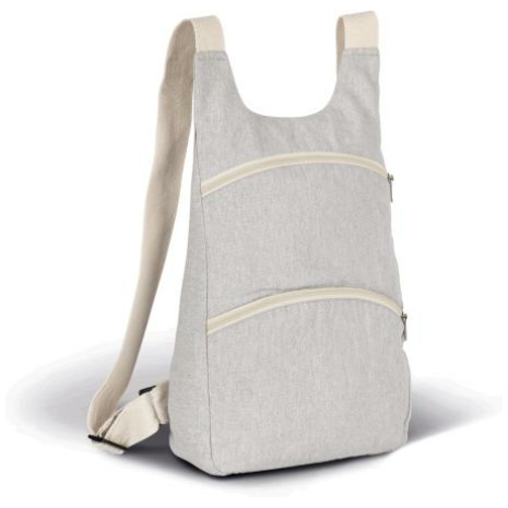 Gerecyclede rugzak met anti-diefstalzak op de achterkant.
