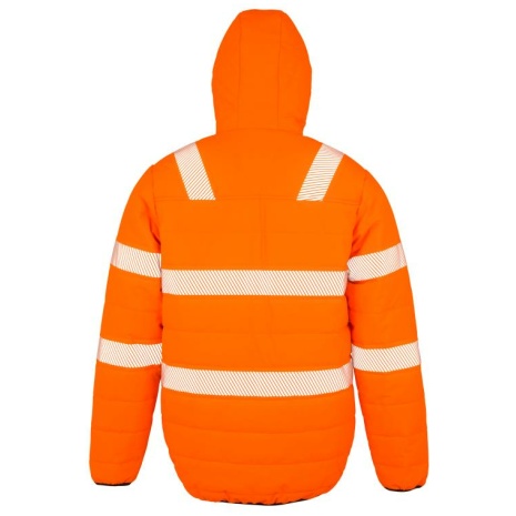 Gerecyclede veiligheidsjas ripstop padded Stof die niet scheurt en bestand is tegen schuring. Gemaakt van vezels van superieure kwaliteit uit petflessen (equivalent van 23 flessen). Zacht en waterafstotend. 100% polyester. 100% gerecycled polyester. Gerecyclede gewatteerde ripstop veiligheidsjas. Bestand tegen schuren met REPREVE®. Vulling van gerecycled polyester 200 g/m² REPREVE®. Vezels gemaakt van gerecyclede petflessen. YKK-ritssluiting aan de voorkant met kinbescherming en schuiver. Tailleband, mouwuiteinden en capuchon met elastische bies. Langer achterpand. Gedrukte reflecterende stroken op het lichaam, de schouders en de mouwen. Zijzakken met rits. Gewatteerde capuchon. Binnenzak. Ophanglus. Norm High Viz: EN ISO 20471: 2013+A1: 2016 Klasse 2 (RIS-3279-TOM Klasse 2 (enkel oranje model)).