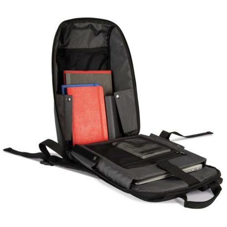 Gerecycleerde rugzak voor laptop Ecologische rugzak van 50% gerecycleerd polyester. Personaliseerbare voorste zak. Verborgen ritszak achteraan. 100% polyester. Rugzak voor (15 inch) het werk, gemaakt van 50% gerecycleerd polyester. Portefeuille-opening met anti-diefstalrits op de achterkant. Personaliseerbare voorzak. Anti-diefstalzakje met ritssluiting op de achterkant. Gewatteerd computervak + 3 grote binnenvakken in mesh met ritsen, voor kabels en accessoires. Achterlipje om de rugzak in de handgreep van de rolkoffer te steken.