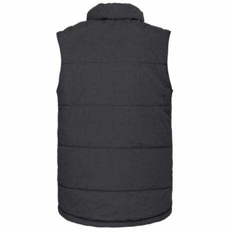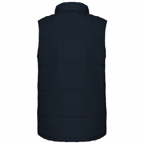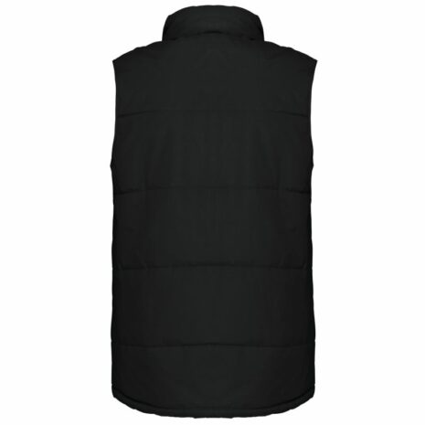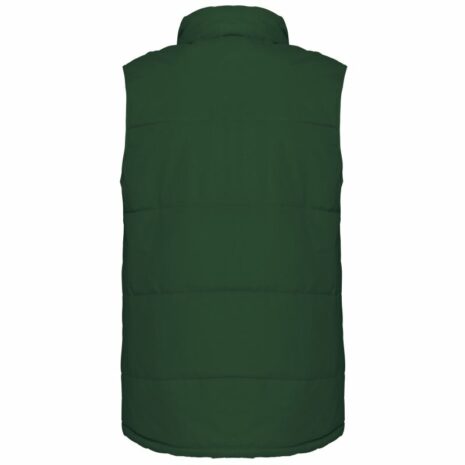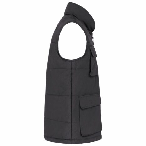 Gewatteerde bodywarmer. PVC-coating voor een betere waterdichtheid van de stof.