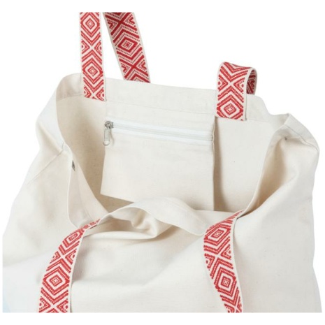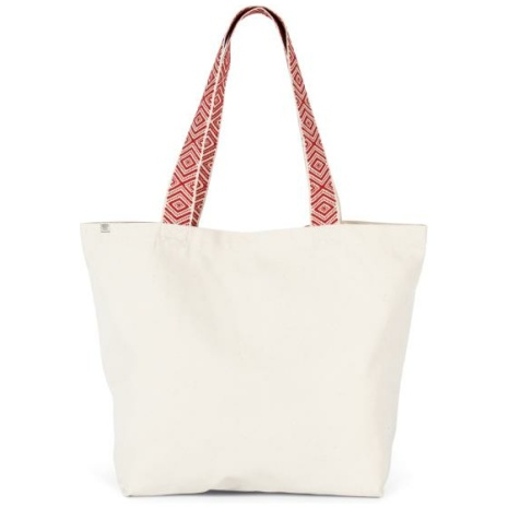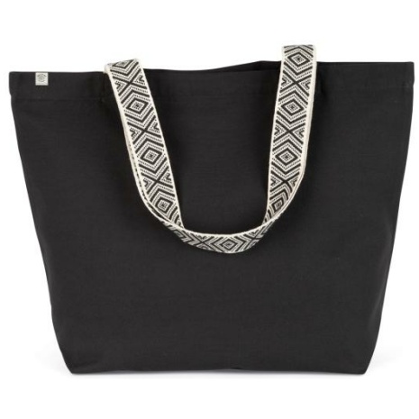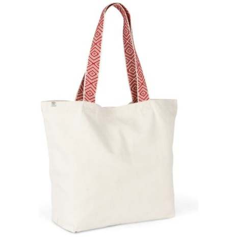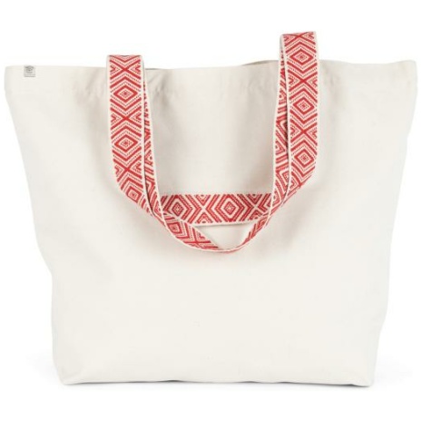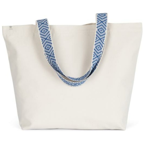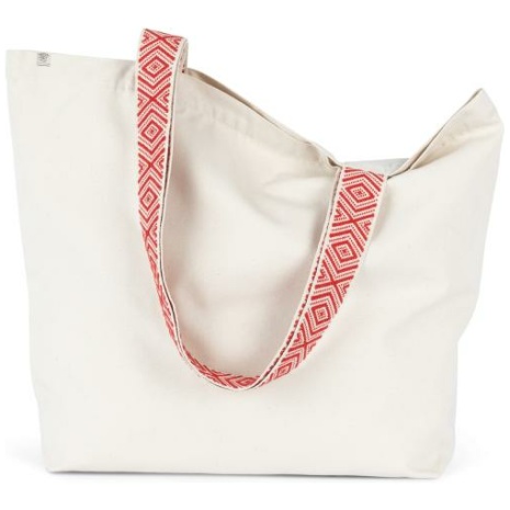 Grote gerecyclede shopper Ritszak aan de binnenkant. Gemaakt van gerecyclede materialen. Geweven canvas. Black Night 285 gsm canvas : 67% gerecycled katoen / 30% gerecycled polyester / 3% andere vezels. Ecume 285 gsm canvas : 75% gerecycled katoen / 22% gerecycled polyester / 3% andere vezels. De comfortabele hengsels hebben een contrasterende kleur met etnisch motief. Ze zijn 60 cm lang en 4,25 cm breed.