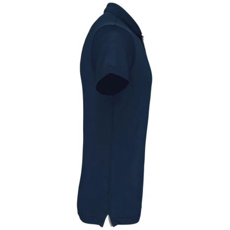 Heren piqué sportpolo Nektape in contrasterende kleur aan de halsopening. Zijsplitten voor meer gemak. Ademende stof. 95% polyester / 5% elasthan. Ademende en anti-statische stof. Piqué. Kraag in rib. Knooplijst met 3 knopen en gecontrasteerde bies. Nektape en zijsplitjes in contrastkleur. Afwerking met dubbele stiksels.
