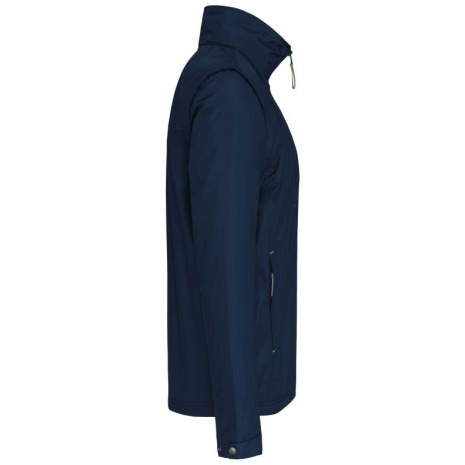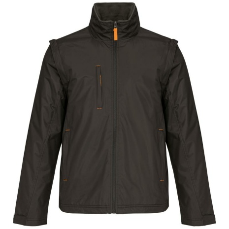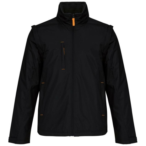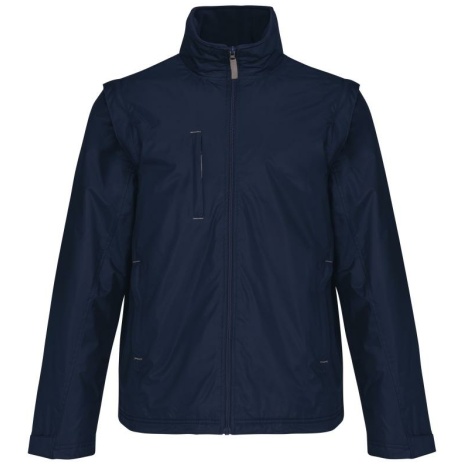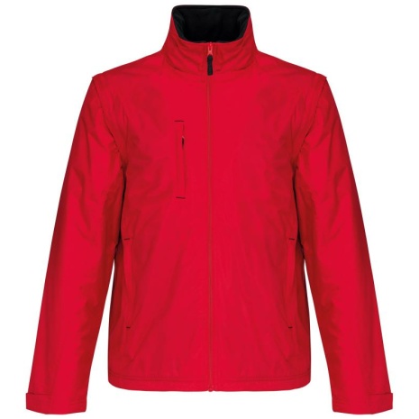 Herenjack met afneembare mouwen PVC-coating voor een betere waterdichtheid van de stof. Sterk, soepel en met thermisch geheugen dankzij de fleecevoering van het lichaam. Veelzijdig en heel functioneel kledingstuk dankzij de uitneembare mouwen. 100% polyester met PVC inductie. 100% polyester fleecevoering. De voering van de mouwen is in 100% polyester + 100% polyesterwatten. Zachte stof. Volledige ritssluiting. 3 zakken met ritssluiting. Afritsbare mouwen. Verstelbare mouwuiteinden. Contrasterende ritstrekker, nektape en stopstiksels. 3 binnenzakken (2 met rits en 1 gsmzakje). Aanrijgkoord aan de binnenkant de jas. Capuchon verwerkt in de kraag. Drukkersrits.