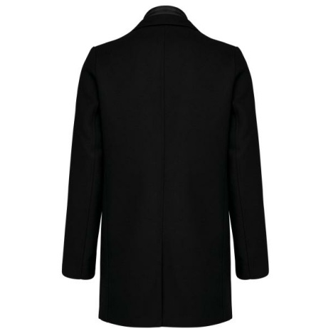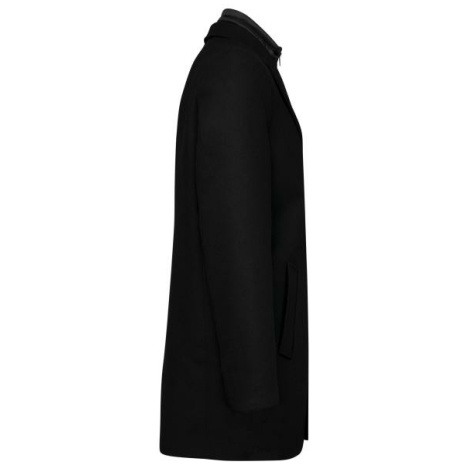 Herenjas 80% polyester en 20% wol. Wollen laken met twillconstructie. Rechte snit. Jas met een afneembaar deel in gewatteerd polyamide met sierstiksel. De kraag en het frontje vooraan zijn afneembaar dankzij een verborgen sluiting binnenin. Ritssluiting met metalen schuiver in het midden vooraan. Twee lage zakken en één borstzak, allemaal omzoomd. Mantelpakkraag en -mouwen. Vilten onderzijde van de kraag. Sluit aan de voorkant met 3 knopen met hoornlook. Schoudervulling. Split in het midden van de rug. Binnenvoering in twillpolyester. Contrasterende, omzoomde binnenzakken, twee borstzakjes, waarvan één met rits, en een gsm-zak. Ophanglus aan de binnenkant in het midden op de rug.