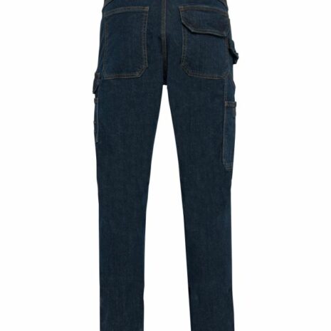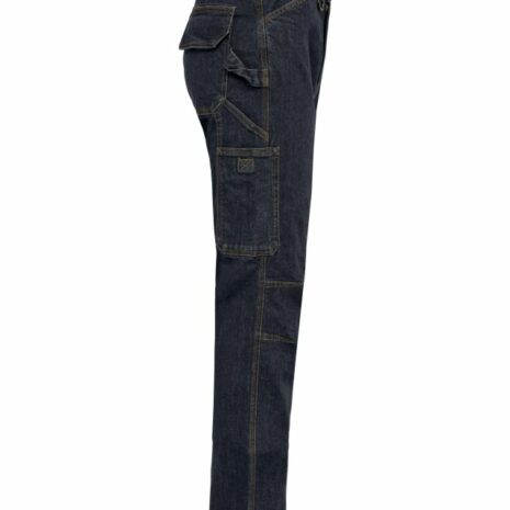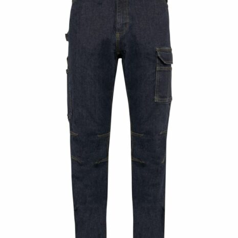 Herenjeans met meerdere zakken Veel zakken en slimme opbergruimte: handig en heel functioneel. Dik, verstevigd en heel comfortabel. Wasbaar op 60 °C: dagelijkse bescherming en hygiëne. 99% katoen / 1% elasthan. Denim. Wasbaar op 60 °C. Fitted pasvorm. Knoopsluiting met knoopklep en metalen rits. Aan de voorkant: 2 zakken met schuine opening. Linkerkant: zak met verstevigende naad en klep met klittenbandsluiting + overzak met 3 vakjes, waarvan 1 met pennenlus. Rechterkant: hamerlus, meterzak + overzak met klittenbandsluiting. Achterkant: 2 opgezette zakken met verstevigende naden, waarvan één met een klep met klittenbandsluiting. Afgeronde tailleband aan de achterkant met brede, elastische en antislip-binnenband voor optimale ondersteuning. Oranje gesp aan de binnenkant in het midden op de rug. Lussen met verstevigende naden, waaronder een grote midden op de rug en 1 plastic ring aan de voorkant. Ruimteplooien aan de knieën, voor meer comfort. Verstevigde kruisplooi voor extra stevigheid en bewegingsvrijheid. Driedubbele stiksels aan zijkanten, binnenkant been en kruis achteraan. Afwerking met dubbel stiksel onderaan de broekspijp. Tear-away merklabel.