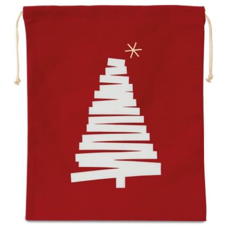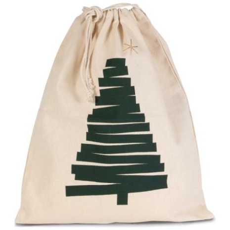 Katoenen koordjestas met dennenmotief Sterk en gemakkelijk te personaliseren. Originele en stijlvolle kerstboomprint. Mooie en handige koordjessluiting van touw. 220 g/m². 100% katoen. Katoenen tas met trekkoord en gedrukte dennenboom. 38x45cm.