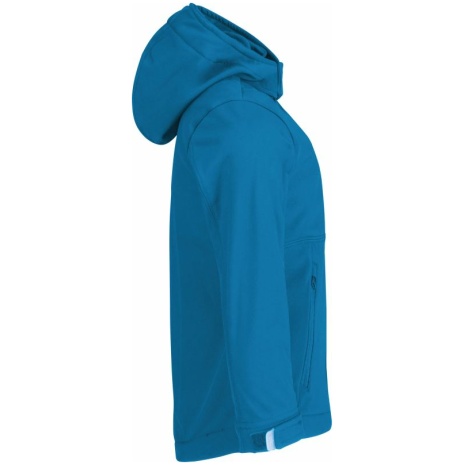 Kids’ hooded softshell jacket Softshell 3 lagen: bescherming, warmte en comfort. Waterdicht 5000 mm. Ademend 1000 g/m²/24 u. Afneembare capuchon. Langere achterkant. Buitenste laag: geweven softshell 94% polyester / 6% elasthan. Tussenlaag: winddichte, ademende laag 1000 g/m²/24u en waterdichte laag 5000 mm. Binnenste laag: microfleece 100% polyester anti-pluis. Meshvoering 100% polyester. Afneembare bivakmutscapuchon met aanpasbare aanrijgkoordjes. Volledige ritssluiting met kinbescherming op de voorkant. 2 ritszakken op de voorkant. Raglanmouwen en mouwuiteinden met klittenbandsluiting. Aanpasbaar met aanrijgkoordjes onderaan. Langere achterkant. Borstrits voor eenvoudige decoratie.