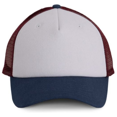 Pet Trucker – 5 panelen Voorpanelen en zonneklep van heel stevig canvaskatoen. Regelbare plastic tong. Eenvoudig en handig. 98% katoen / 2% polyester. Truckerpet met 5 panelen. Voorste panelen en zonneklep van canvaskatoen en mesh van polyester. Verstelbare druksluiting van plastic.