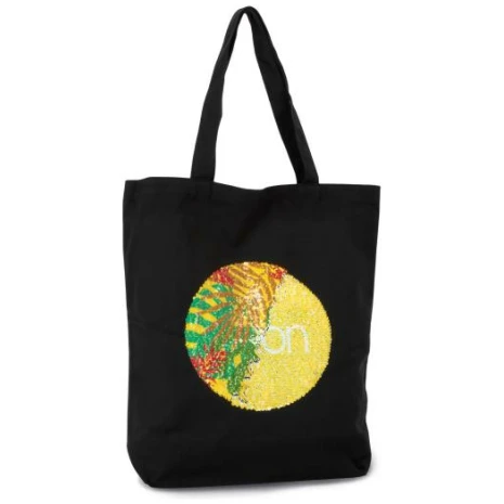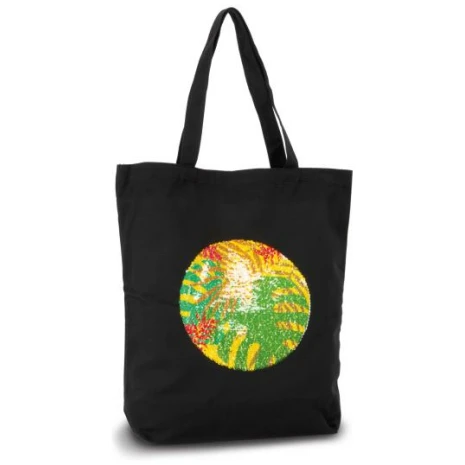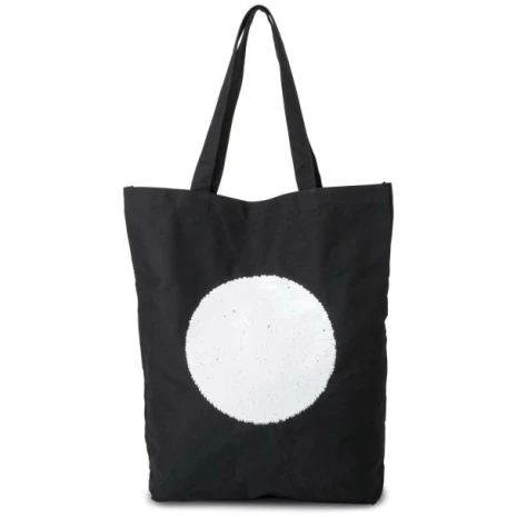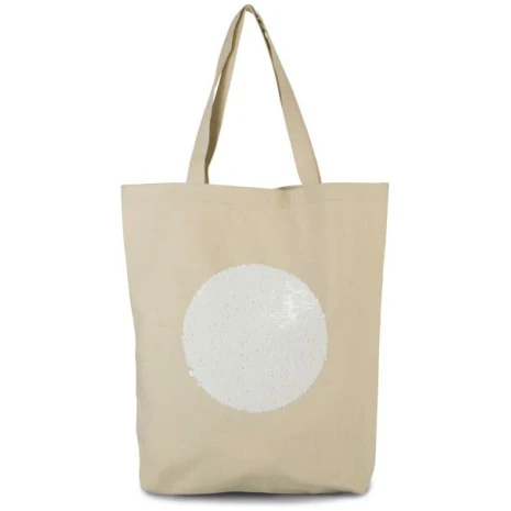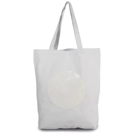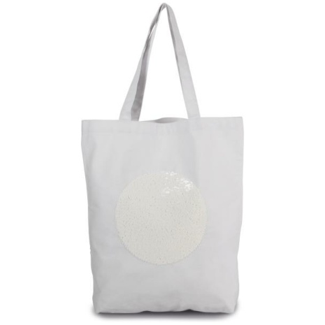 Shopper met lovertjes Ideaal voor een dubbelzijdige opdruk: 2 boodschappen naar wens. Bedrukking gesuggereerde sublimatie. Soepel en sterk katoencanvas. Shopper van katoencanvas met geborduurde lovertjes op de voorkant. Dubbelzijdige lovertjes, voor een 2-in-1 opdruk: een zichtbare opdruk en één die tevoorschijn komt wanneer men over de lovertjes wrijft. Geschikt voor sublimatie.