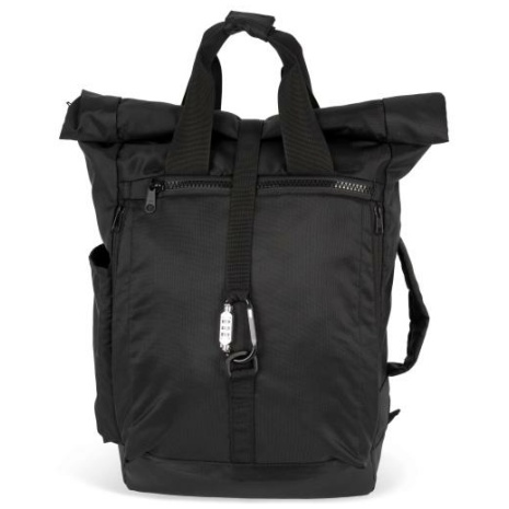 Sportrugzak met diefstalbeveiliging en afneembaar heuptasje Sportrugzak met sluithaak en cijferslot tegen diefstal. De sluiting met rits bovenaan wordt opgerold en met het lint vastgemaakt aan het cijferslot. Binnenin zit een uitneembaar heuptasje. 100% polyamide. Sportrugzak met antidiefstalkabel en sluithaak met cijferslot. Geïntegreerd en afneembaar heuptasje. Ritssluiting aan de bovenkant. Voor extra veiligheid zit er aan de bovenkant een oprolsluiting met veiligheidslint bevestigd aan de sluithaak. Vooraan een grote, eenvoudig personaliseerbare zak en schoenenvak met openingen opzij, voor betere ventilatie. Gewatteerd laptopvak binnenin. Spulletjeszak met ritssluiting op het bovenste deel. Opzij een gewatteerde handgreep en bovenaan een handgreep met klittenbandsluiting. Een buideltasje voor waardevolle items zit met een drukknoop aan de binnenkant van het achterpaneel bevestigd en kan zonder de rugzak worden gebruikt dankzij de verstelbare riem met gesp.