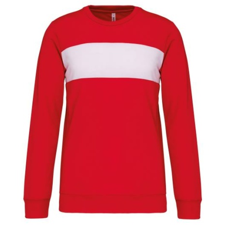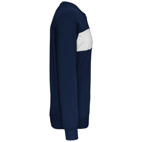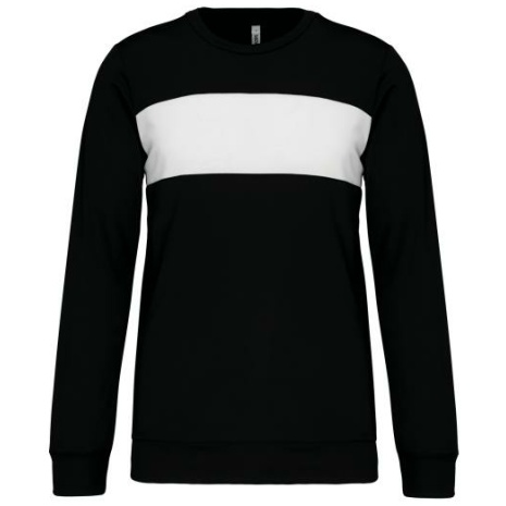 Sweater in polyester 100% polyester: heel sterk. Nektape op de binnenzijde van de kraag. 100% polyester. Polytricot. Contrasterende bies van ongeveer 11,50 cm hoog aan de voorkant. Ronde hals. Nektape op de binnenzijde van de kraag. Ribboord met elasthan aan de kraag, de mouwuiteinden en de onderkant.