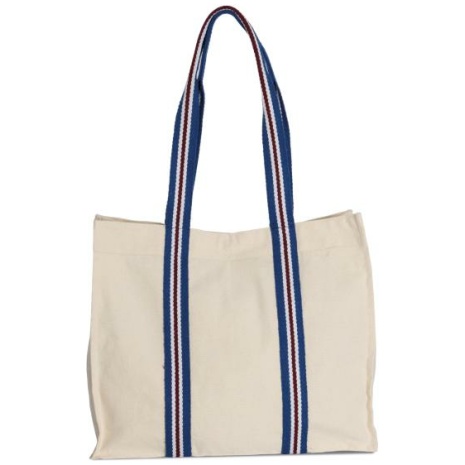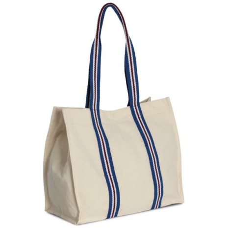 Trendy shopper van biologisch katoen 100% biologisch katoen OCS100-label, afgeleverd door Ecocert Greenlife. Contrasterende gestreepte handvatten voor een originele en aantrekkelijke look. Magnetische knop voor een snelle en handige sluiting. 100% katoen. Shopper met plooi. Gemaakt van 100% biologisch katoen. Hengsel met contrasterende strepen. Binnenzak. Sluiting met een magnetische knoop.