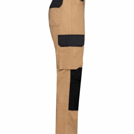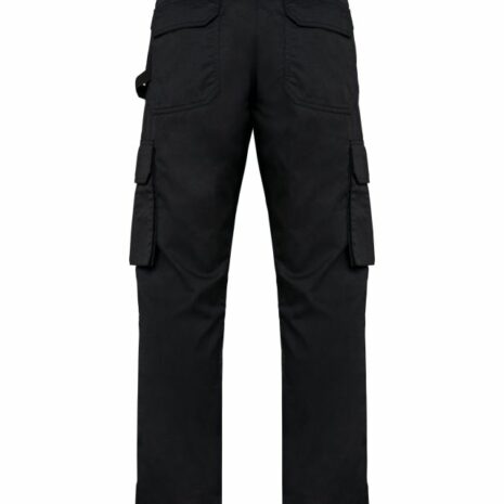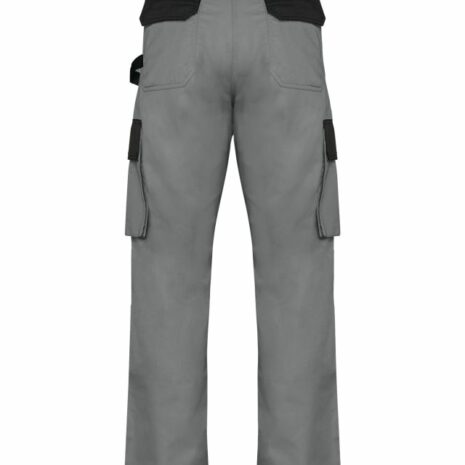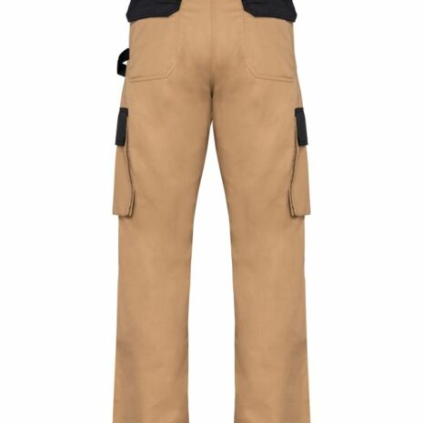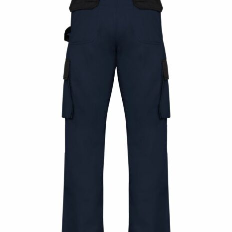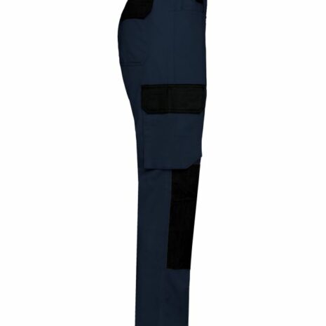 Tweekleurige heren werkbroek Comfortabel, stevig en trendy. Handig, met veel verschillende zakken voor veel opbergruimte. Versteviging in Cordura® op de knieën. 65% polyester / 35% katoen. Wasbaar op 60 °C. Rechte snit. 2 zakken aan de voorkant (binnenzakken in de hoofdstof), waarvan 1 met een binnenzakje dat sluit met een contrasterende klep (behalve voor de kleur zwart). 2 losse cargozakken met ruimteplooi en contrasterende klep (behalve voor de kleur zwart) met klittenbandsluiting, waarvan één met 2 vakken en plaats voor gereedschap. 2 achterzakken met klep en klittenbandsluiting, 1 hamerlus links (bij het dragen). 2 contrasterende kniebeschermerzakken in Cordura® (in het zwart voor alle kleuren) met klittenbandsluiting en klep binnenin om de kniebeschermers op hun plaats te houden en aan te passen. Tailleband met lussen. Op de tailleband zit aan de voorkant links (bij het dragen) een plastic ring. Ritssluiting met knoop (metalen knoop bekleed met plastic). Dubbel stiksel in de zijnaden, drievoudig stiksel in het kruis voor- en achteraan. Kniebeschermers niet inbegrepen. Biesstiksel tussen de benen. Tussenbeenlengte van 80 cm en zoom van 5 cm. Afneembaar merklabel.