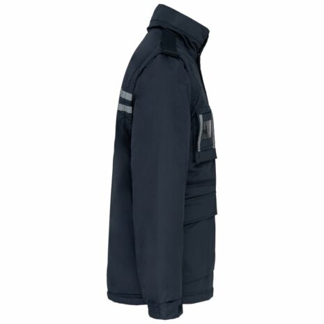 Workwear Parka Met Afritsbare Mouwen PVC-coating voor een betere waterdichtheid van de stof. Betere zichtbaarheid en bescherming dankzij de reflecterende stroken en de verstevigende stroken aan de schouders. Handig en aanpasbaar: veel zakken waarvan één transparante voor een badge. Afneembare mouwen. 100 % polyester. Buitenkant 100% polyester ripstop. PVC inductie. Binnenkant: volledig gevoerd met polyesterwatten, achterkant en binnenkant van de kraag in fleece. Ritssluiting met stormoverslag en drukknopen. Afritsbare mouwen. 5 functionele voorzakken waarvan 1 een transparante badgehouder. 1 binnenzak. Reflecterende details op de achterkant en borstzak. Verstevigde schouders. Zijdelings rits onderaan voor meer bewegingsvrijheid. Aanrijgkoord ter hoogte van de taille. Capuchon in de kraag. Drukkersrits onderaan en ter hoogte van de borst.